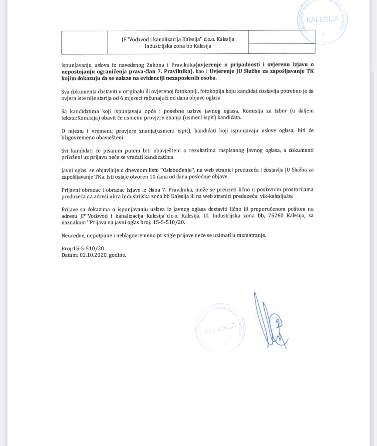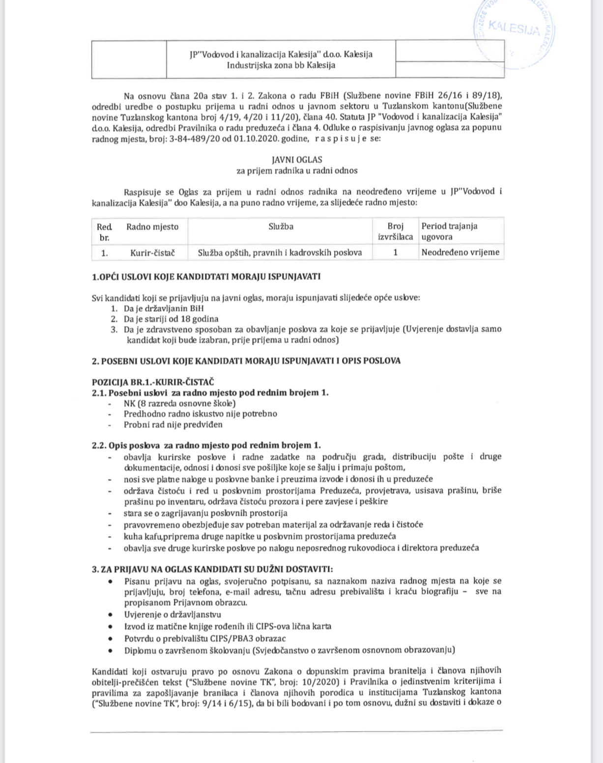 JP Vodovod i kanalizacija Kalesija raspisuje javni oglas za prijem radnika u radni odnos na sljedeću radnu poziciju: