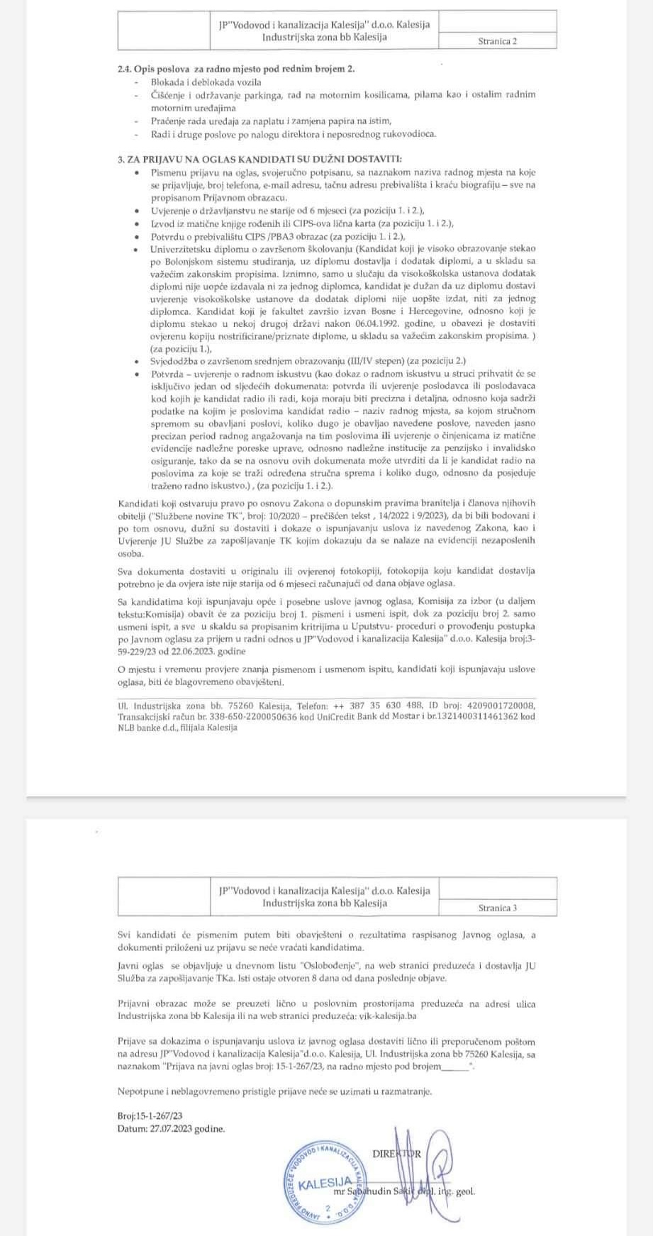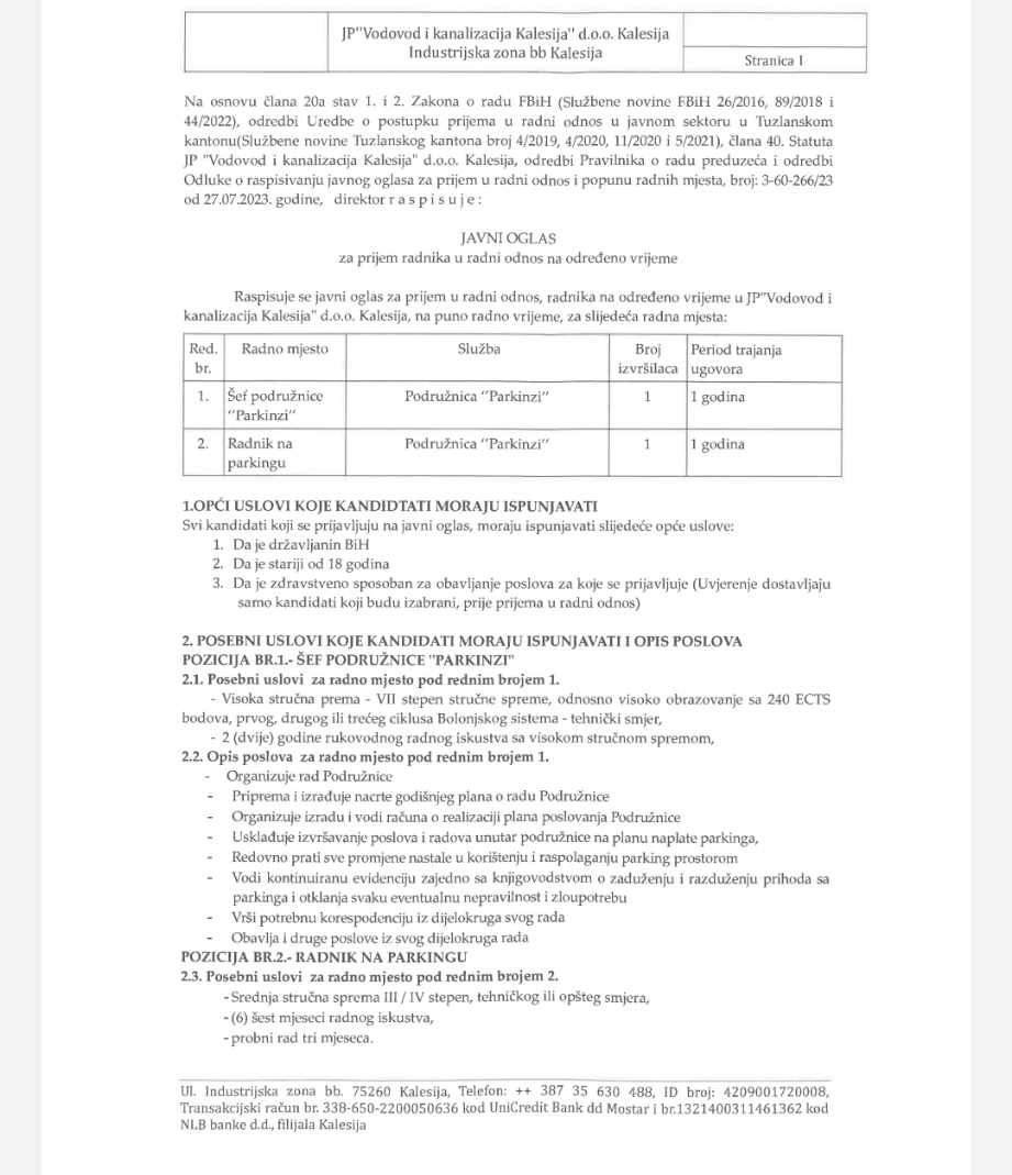 JP Vodovod i kanalizacija Kalesija doo je danas (četvrtak, 27.07.2023) objavilo JAVNI OGLAS za prijem radnika u radni odnos na određeno vrijeme.