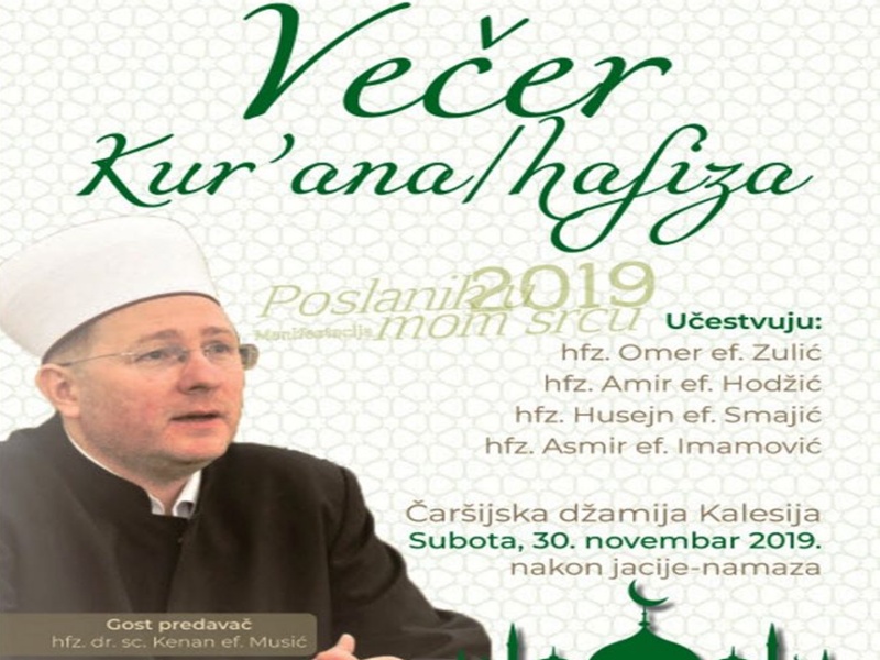 U subotu, 30. novembra 2019. godine, u Čaršijskoj džamiji u Kalesiji održat će se “Večer Kur'ana / hafiza” čime će se okončati manifestacija “Poslanik u mom srcu 2019”.