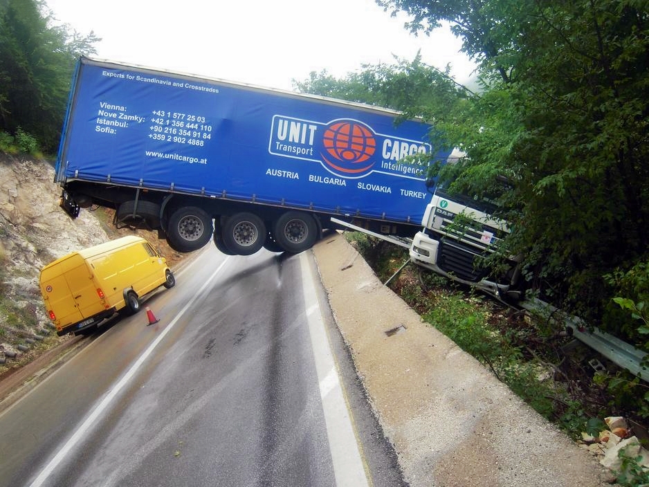 Vozač kamiona je vozeći po mokroj cesti izgubio kontrolu i potom udario i probio zaštitnu ogradu, nakon čega je prednji dio kamiona završio u jarku, dok je prikolica ostala na cesti i blokirala jednu traku.