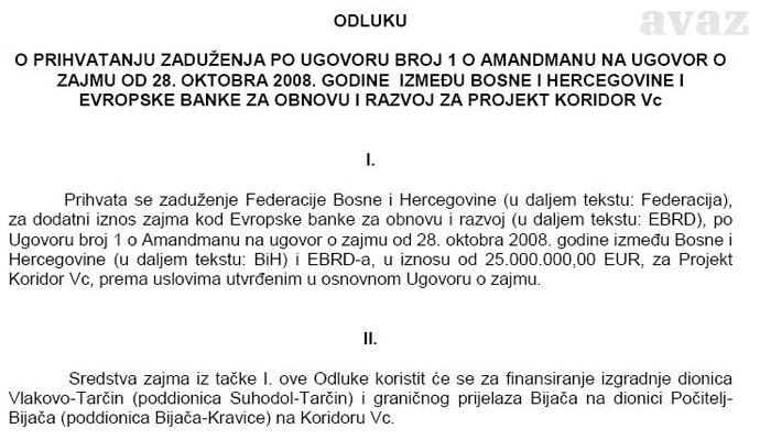 U ovome ne bi bilo ništa sporno da ugovorom o zajmu između BiH i EBRD-a, koji je 2008. godine potpisan u Sarajevu, nisu zaokružena odobrena kreditna sredstva za dionice autoputa na koridoru 5C u iznosu od 180 miliona eura, odnosno 360 miliona maraka.