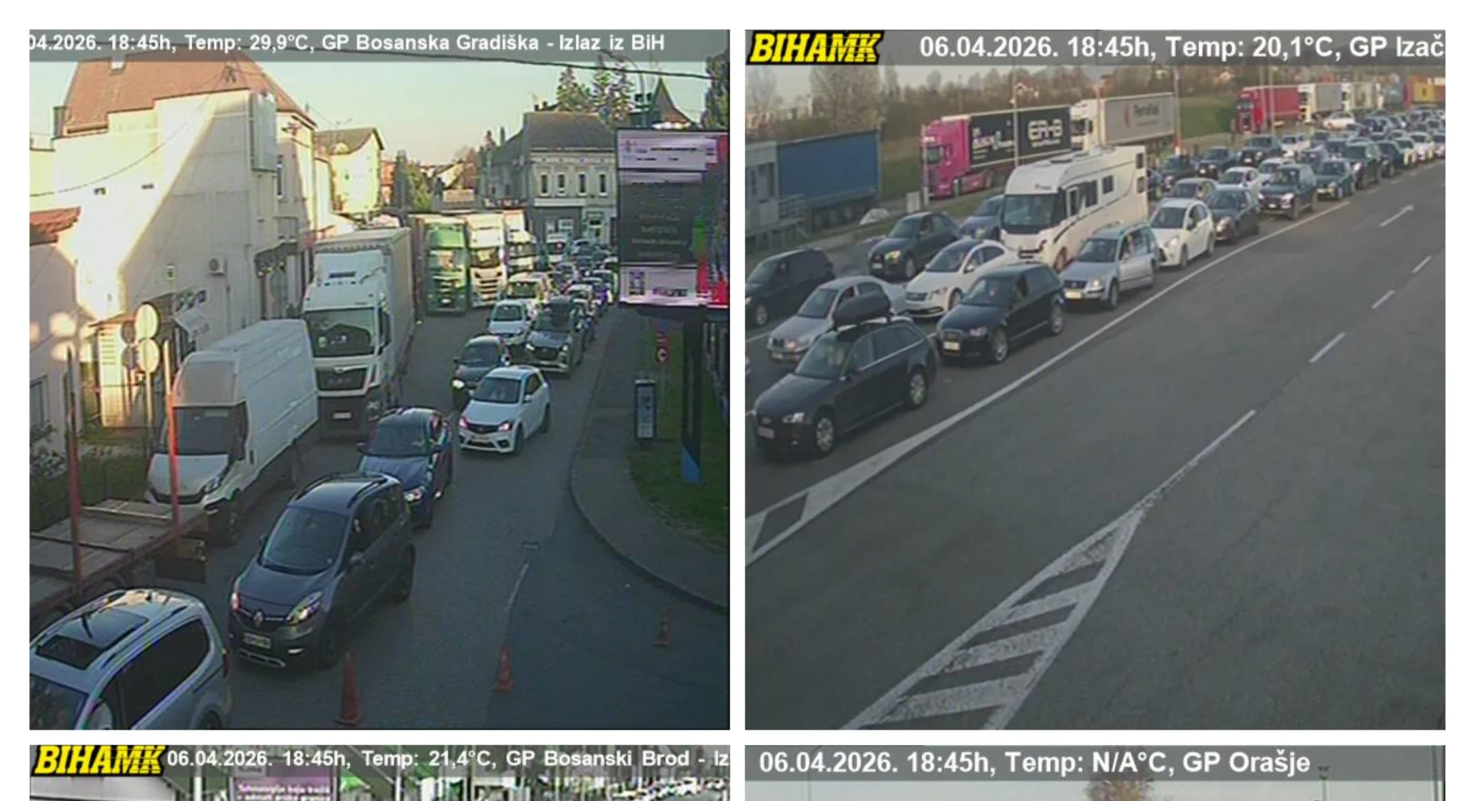 Pojačan intenzitet saobraćaja i gužve su zabilježene na više graničnih prelaza na izlazu iz Bosne i Hercegovine, gdje su formirane duge kolone vozila, potvrđeno je iz BIHAMK-a. Najveće gužve evidentirane su na prelazima Izačić, Velika Kladuša, Hadžin Potok, Kostajnica, Kozarska Dubica, Gradina, Gradiška, Novi Grad, Brod, Orašje i Brčko.