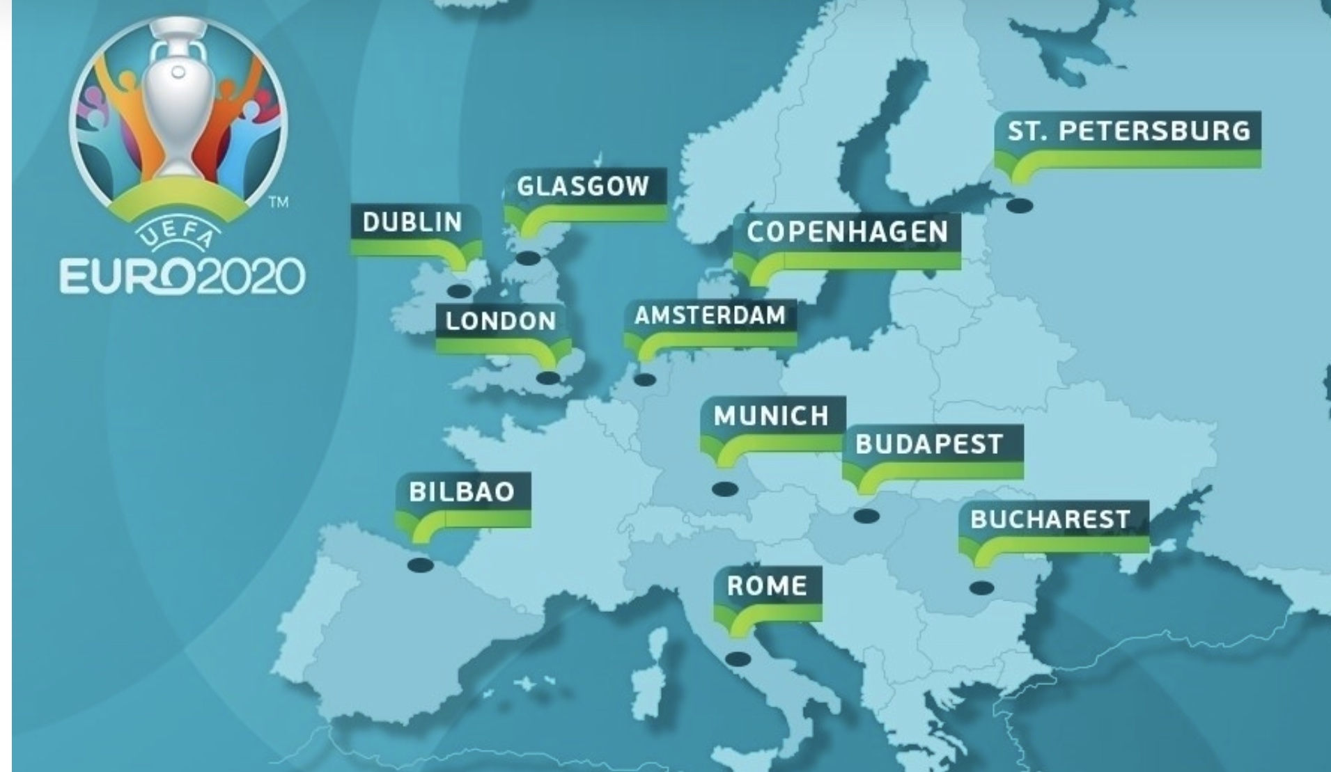 Euro 2020. igrat će se u 12 gradova i država: Rimu (Italija), Londonu (Engleska), Bakuu (Azerbejdžan), Bilbau (Španija), Kopenhagenu (Danska), Minhenu (Njemačka), Budimpešti (Mađarska), Dablinu (Republika Irska), Amsterdamu (Holandija), Bukureštu (Rumunija), St. Petersburgu (Rusija) i Glazgovu (Škotska).