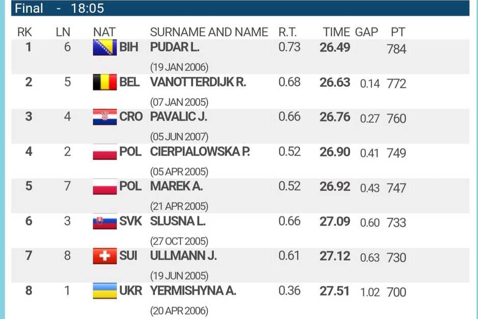 Pudar je svoju posljednju utrku na ovogodišnjem prvenstvu u rumunskom Otopeniju isplivala u vremenu 26.49, što joj je bio dovoljno za prvu poziciju i još jedno zlato.