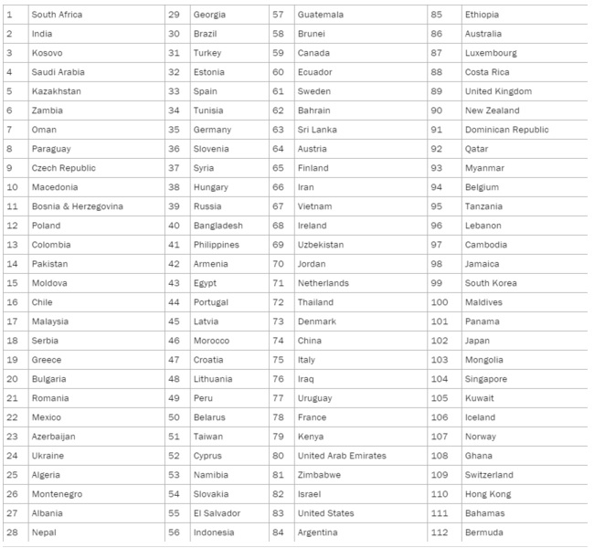 Prema ovoj listi, Bosna i Hercegovina se nalazi na 11. mjestu od 112 zemalja svijeta.