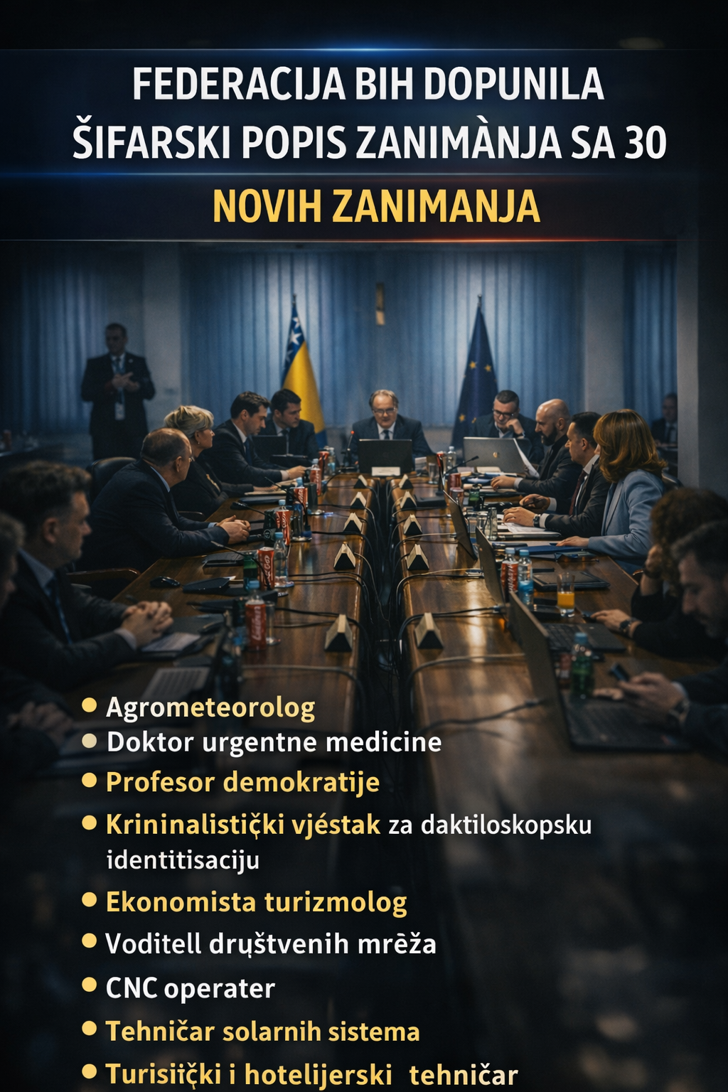 - Iz Vlade Federacije Bosne i Hercegovine su saopćili da su dopunili odluku o klasifikaciji zanimanja u ovom entitetu, tj. da je Šifarski popis zanimanja dopunjen s 30 novih.