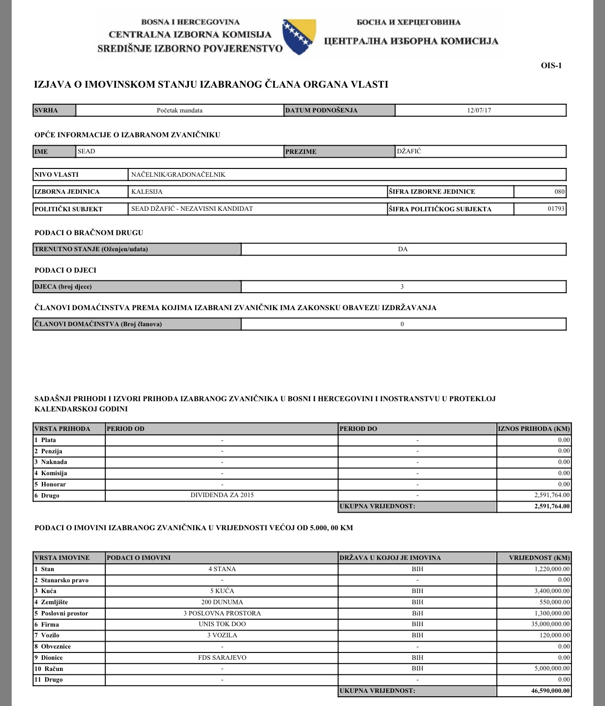 Prvi čovjek Općine Kalesija, koji se privatnim biznisom počeo baviti još davne 1988. godine, samo od dividende za 2015. godinu je uprihodio 2.591.000 KM, a u imovinskom kartonu naveo je četiri stana, pet kuća, 200 dunuma zemljišta, tri poslovna prostora, firmu “Unis tok”, tri vozila, dionice u FDS Sarajevo, te ušteđevinu, a sve skupa vrijedi oko 46,6 miliona KM, prenosi Klix.ba.