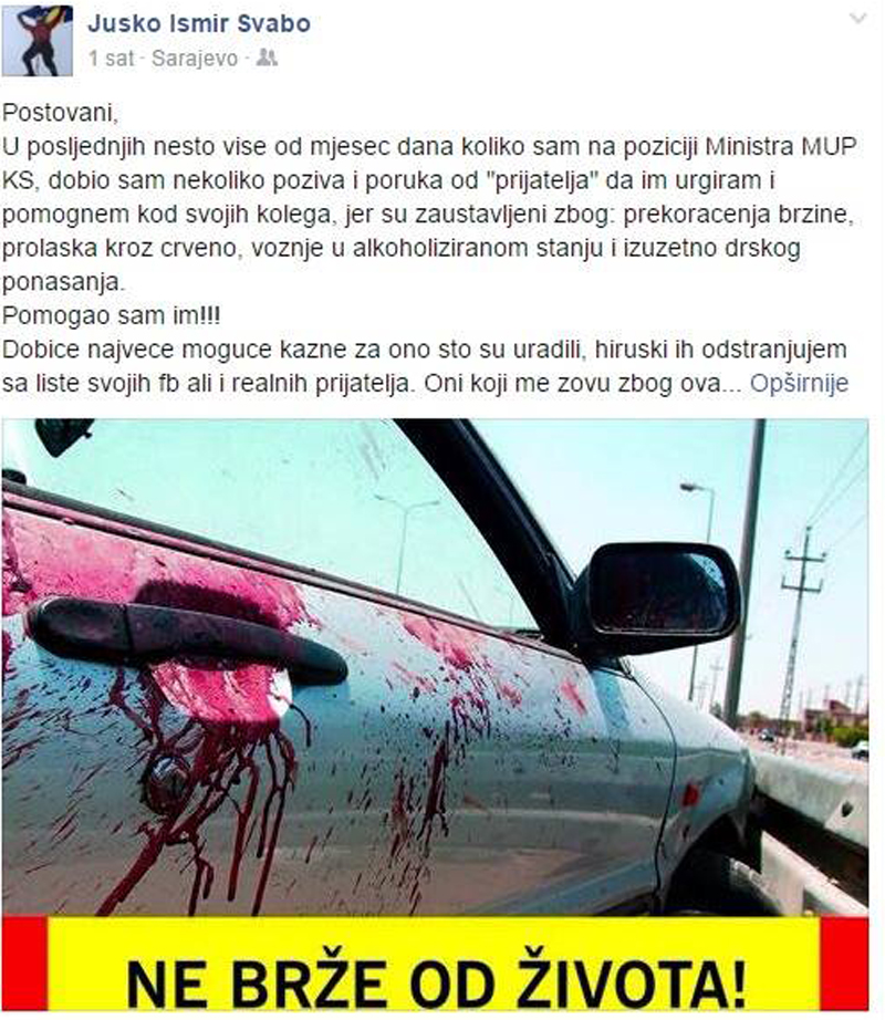 Ministar unutrašnjih poslova Kantona Sarajevo Ismir Jusko Švabo obratio se putem društvene mreže Facebook svojim, kako ih naziva, “prijateljima” koji od njega u posljednjih mjesec dana traže da im “sredi” brisanje saobraćajnih i ostalih kazni koje su počinili.
