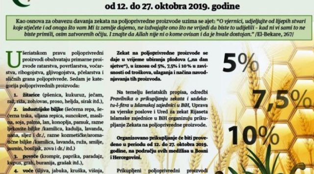 I ove godine na području Medžlisa Islamske zajednice Kalesija će se sprovesti akcija prikupljanja zekata na poljoprivredne proizvode u terminu koji je određen od strane Ureda za zekat, odnosno u terminu od 12. do 27. oktobra 2019. godine.