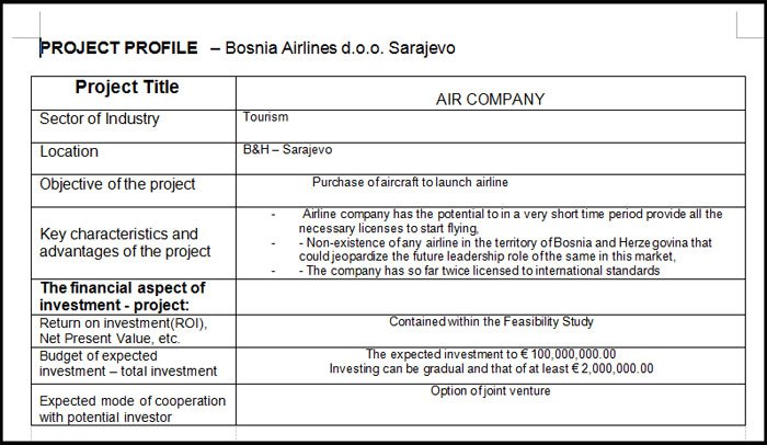Riječ je, zapravo, o privatnoj kompaniji Bosnia Airlines koja već odranije postoji, ali nema svoj avion. Kompanija traži strateškog partnera koji će uložiti novac u nabavku aviona kako bi naša zemlja dobila domaću aviokompaniju kakve imaju i sve ostale evropske zemlje.