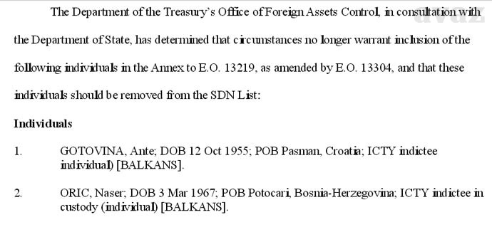 Po njoj, Oriću se ukida zabrana raspolaganja bilo kakvom imovinom koju eventualno ima u SAD i dopušta putovanje u ovu zemlju. Osim za njega, ista je odluka donesena za Antu Gotovinu, generala Hrvatske vojske.