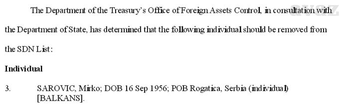 Kao posebno izdvojena od ova dva slučaja, ali istovjetna, donesena je i odluka da se s crne liste skine i Mirko Šarović, donedavni ministar vanjske trgovine i ekonomskih odnosa BiH i trenutni visoki funkcioner SDS-a.