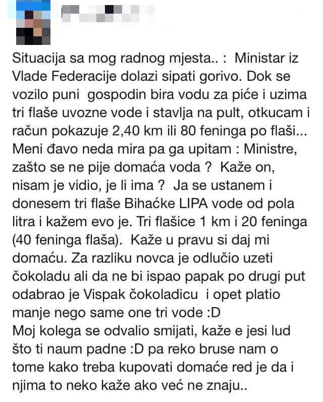— Na društevnim mrežama se od jučer širi priča jednog uposlenika na benzinskoj pumpi, koji je očitao pravu bukvicu jedmom ministru u Vladi FBiH…