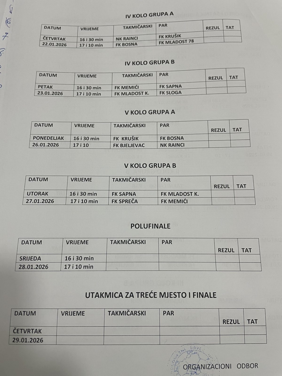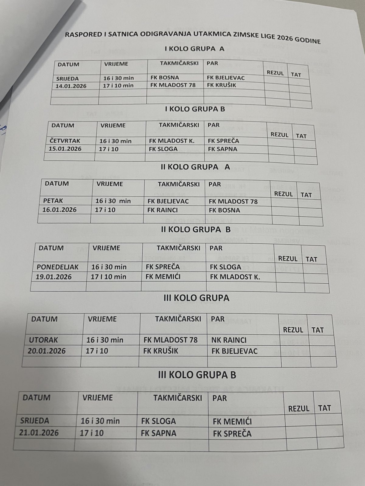 Svečano otvaranje Zimske futsal lige planirano je za 14. januar (srijeda) 2026. godine između dvije utakmice,tačnije u 17,00 sati.