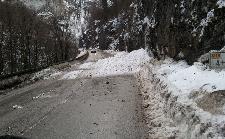 Odron od desetak kubnih metara jugovog snijega i kamena pao je na kolovoz i predstavlja opasnost za vozače pri većoj brzini.