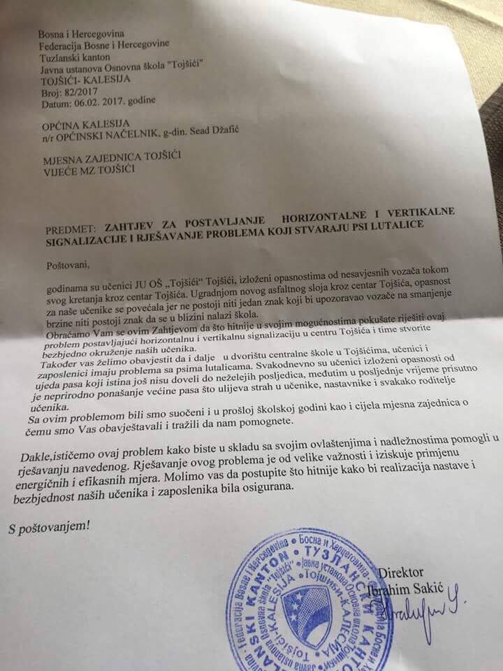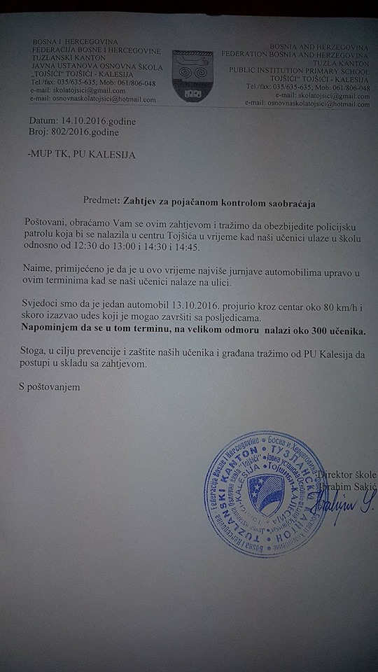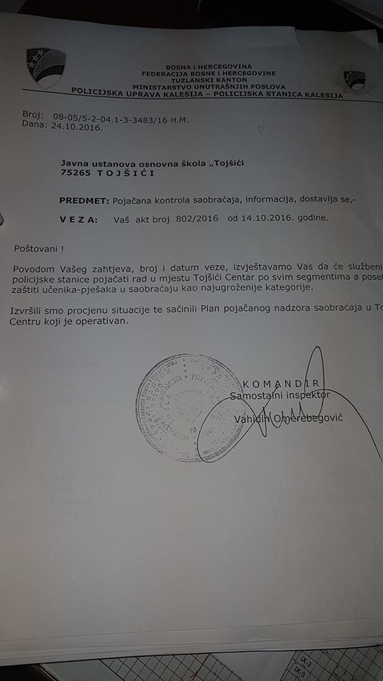 Još prije nekoliko dana, na adresu NKP.BA je stiga dopis koji je JU OŠ Tojšići još u oktobru 2016. godine poslala MUP-u TK, tačnije Policijskoj stanici Kalesija. Kako nam je rečeno, iz PU Kalesija su poslali pozitivan odgovor na “zahtjev” menadžmenta škole da se pojača kontrola policije u centru Tojšića, ali nikada nisu primjetili da se to u praksi primjenjuje.