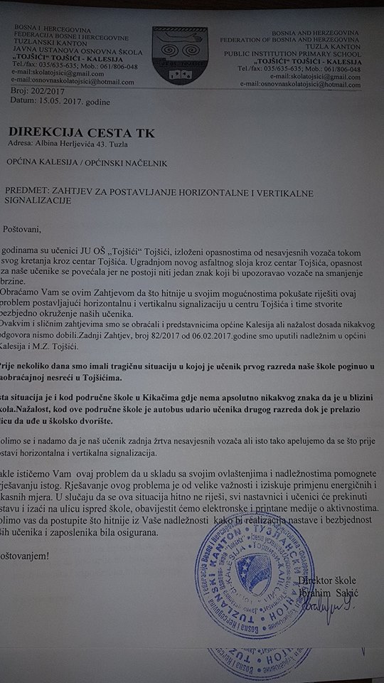 Početkom februara 2017. je poslat i dopis općinskom načelniku sa zahtjevom da se postavi horizontalna i vertikalna signalizacija u blizini škole u Tojšićima, ali u školu nikada nije stigao povratni odgovor.