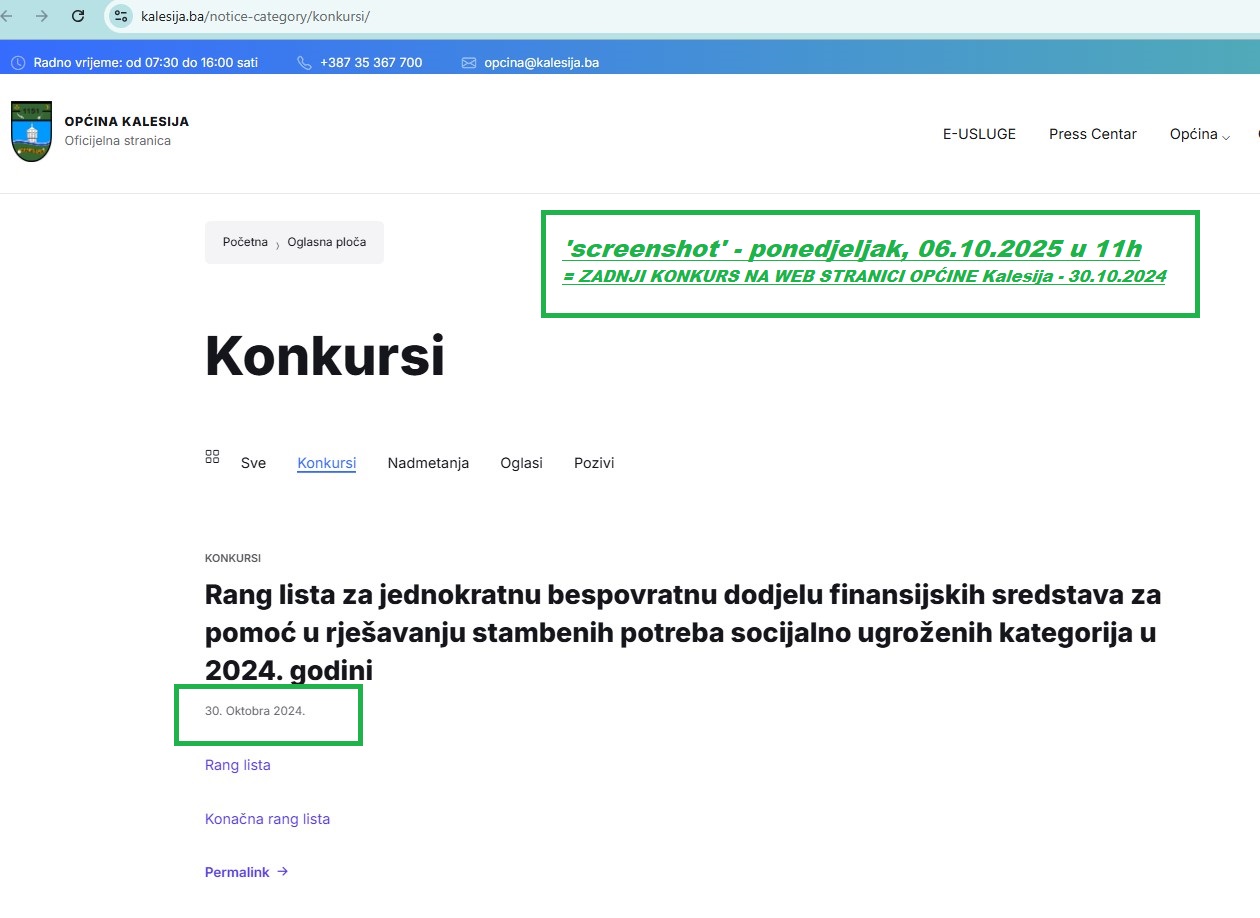 >> Zanimljivo je pomenuti da Općina Kalesija na oficijelnoj web stranici nije objavila niti jedan Konkurs od dolaska novog načelnika (11.mjesec 2024.godine), odnosno da je zadnji Konkurs objavljen oktobru 2024.godine.