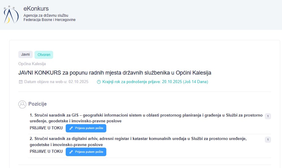 “Agencija za državnu službu FBIH” je na dopis Općine Kalesija 02.10.2025. objavila Javni konkurs za zapošljavanje u Općini Kalesija za dva radna mjesta;