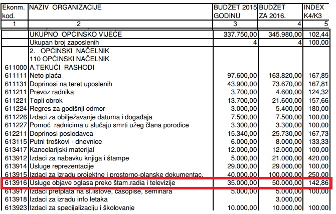 Stavka  za medijsko oglašavanje, odnosno precizno navedeno u budžetu “Usluge objave oglasa preko štampe, radia i televizije”  je u 2015. godini iznosila 35.000 KM, dok je prema planiranom budžetu za 2016. godinu ova stavka povećana za 15.000 KM, i iznosi 50.000 KM.