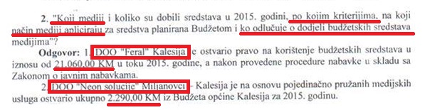 Prema odgovoru načelnika Nedžada Džafića, “Radio Feral” je dobio 21.060,00 KM, dok je kalesijska televizija NTV dobila 2.290,00 KM.