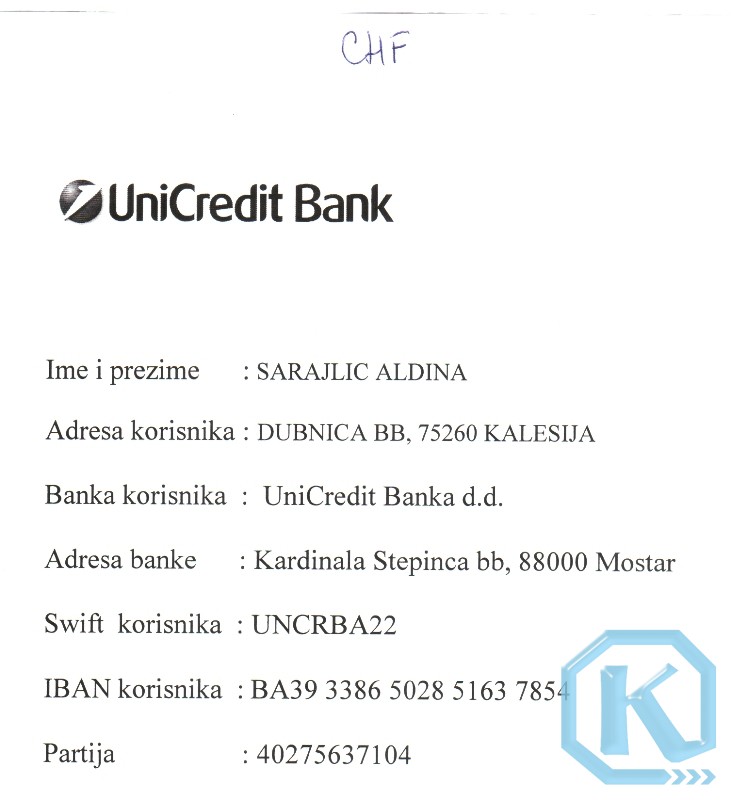 SWIFT: UNCRBA22 (POGLEDATI FOTOGRAFIJE ISPOD ZA UPLATE IZ INOSTRANSTVA)