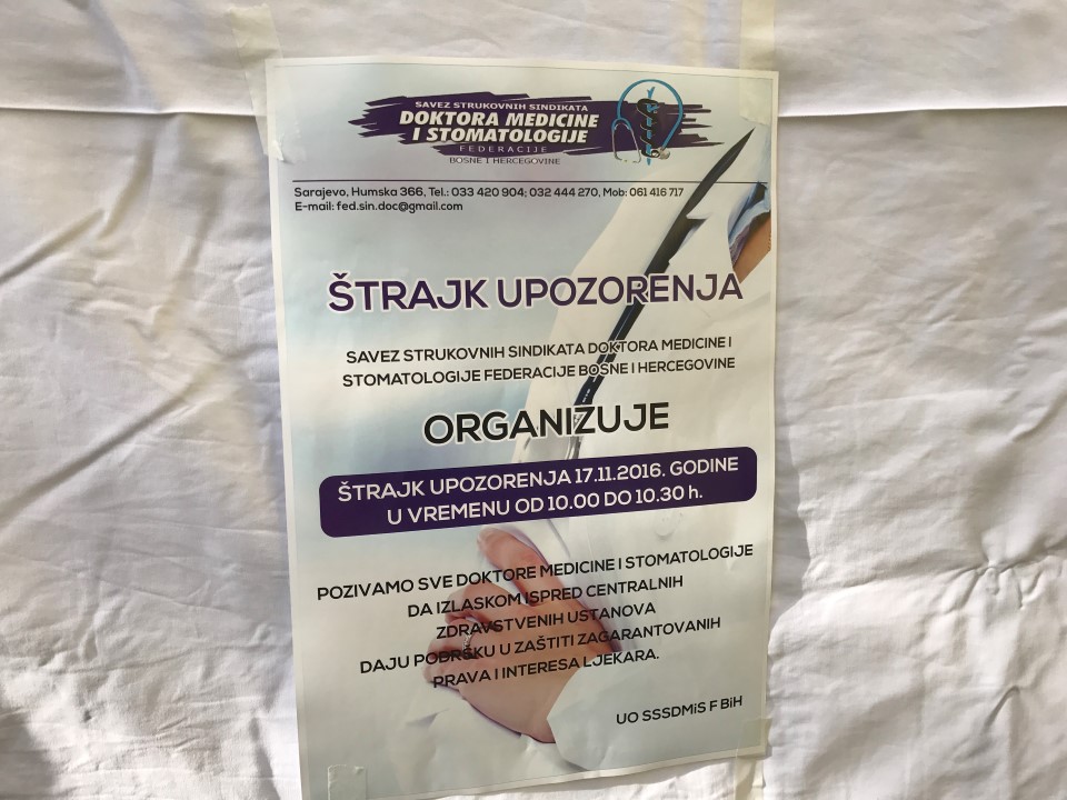 Sindikata doktora medicine i stomatologije Federacije BiH je danas (četvrtak, 17.novembra) organizovao polusatni štrajk upozorenja u svim zdravstvenim ustanovama na području FBiH.