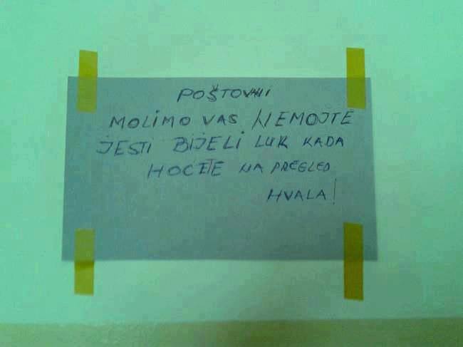 Home Bosna i Hercegovina Poštovani pacijenti, molimo vas, nemojte jesti bijeli luk prije pregleda Bosna i HercegovinaWebcaffeZanimljivosti Poštovani pacijenti, molimo vas, nemojte jesti bijeli luk prije pregleda By S.S. - 25. Augusta 2013. 477 0 SHARE Facebook Twitter Fotografija koja je proteklih dana postala “Hit” na društvenim mrežama. “Poštovani pacijenti, molimo vas, nemojte jesti bijeli luk prije pregleda” ( radiosarajevo/NKP.ba )