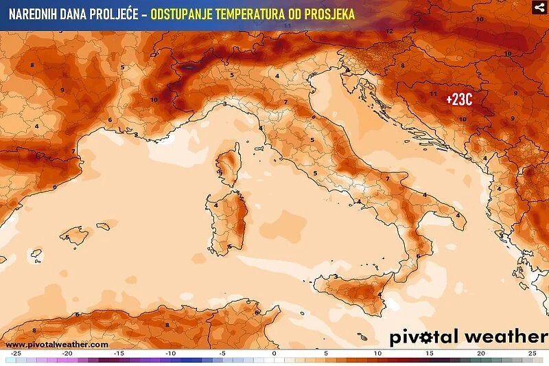 Pretežno sunčano i toplo vrijeme uz temperature lokalno do oko 20 stepeni će se nastaviti i u narednim danima – do kraja radne sedmice. Najtoplije će biti, prema trenutnim vremenskim izgledima, u dijelovima sjeverne i sjeveroistočne Bosne gdje su lokalno mogući dnevni maksimumi i do čak 23 stepena Celzijusa.