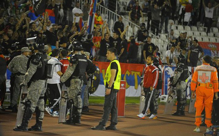 Prethodno su baklje uletjele na teren, nakon čega se zastava Albanije zavijorila iznad Partizanovog stadiona u Beogradu.