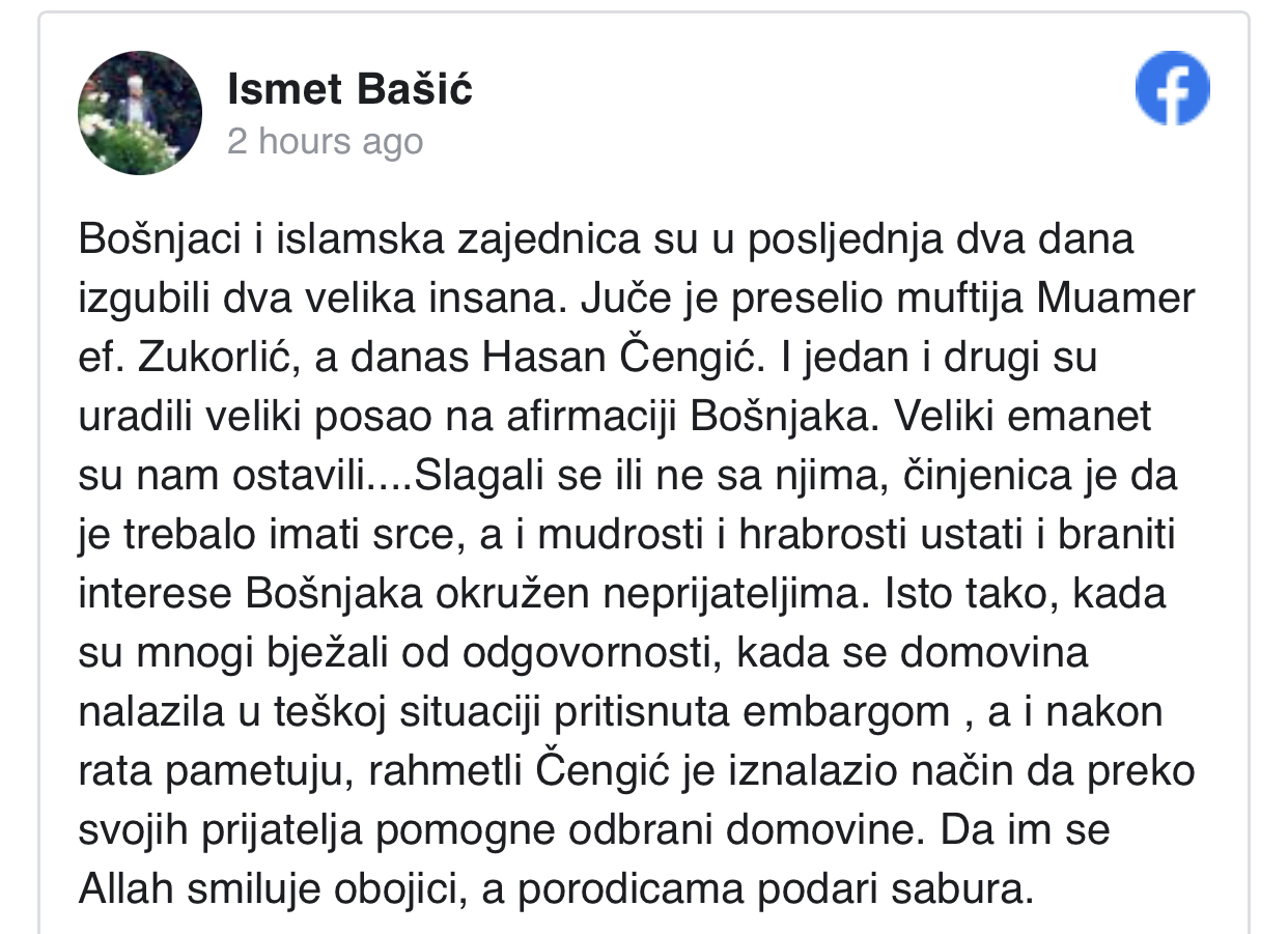 Jedan od osnivača SDA i dugogodišnji funkcioner i političar, Hasan Čengić, je preminuo u 65. godini. Vijest su objavili njegovi poznanici na društvenim mrežama.