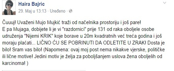 Haira, koja živi i radi u Švicarskoj, predjsednik udruženja „Nijemi krik“, je putem društvene mreže Facebook poručila Muji;