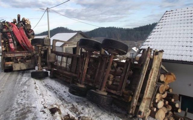 Prikolica kamiona koji je bio natovaren balvanima prilikom mimoilaženja sa drugim vozilom se prevrnula, a balvani koji su se nalazili u prikolici su se prosuli i udarili u kuću.