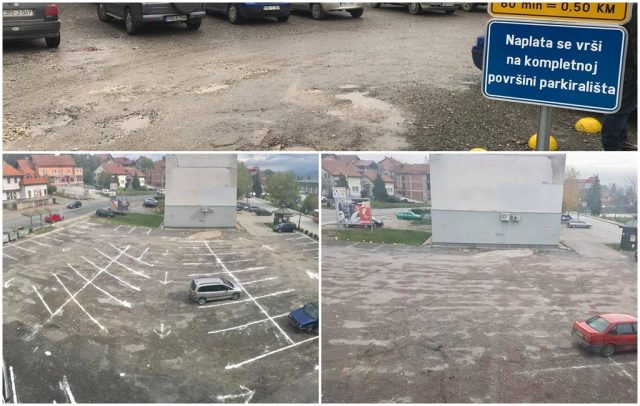 Dva velika parking placa nisu asfaltirana, a rješenje za to odgovorni su pronašli tako što su postavili tablu kojom se “precizira” da je cijela površina parking prostor.