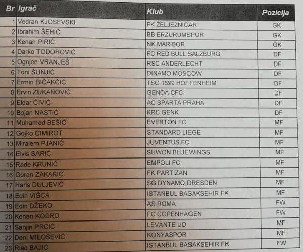 Odbrana: Darko Todorović (Salzburg), Ognjen Vranješ (Anderlecht), Toni Šunjić (Dinamo Moskva), Ermin Bičakčić (Hoffenheim), Ervin Zukanović (Genoa), Eldar Ćivić (Sparta Prag), Bojan Nastić (Genk).