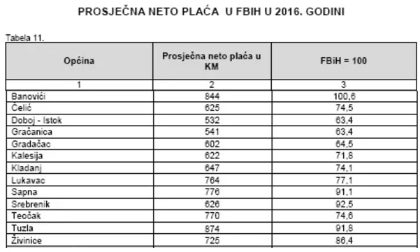 Najviša prosječna neto plaća u Federaciji u prošloj godini bila je u sarajevskoj općini Centar – 1.197 maraka, dok je najniža u Doboj-Istoku 532 KM. Ta općina je tako s trona s najnižom prosječnom plaćom skinula Gračanicu, u kojoj je prosječna plaća u 2015. godini bila svega 524 KM.