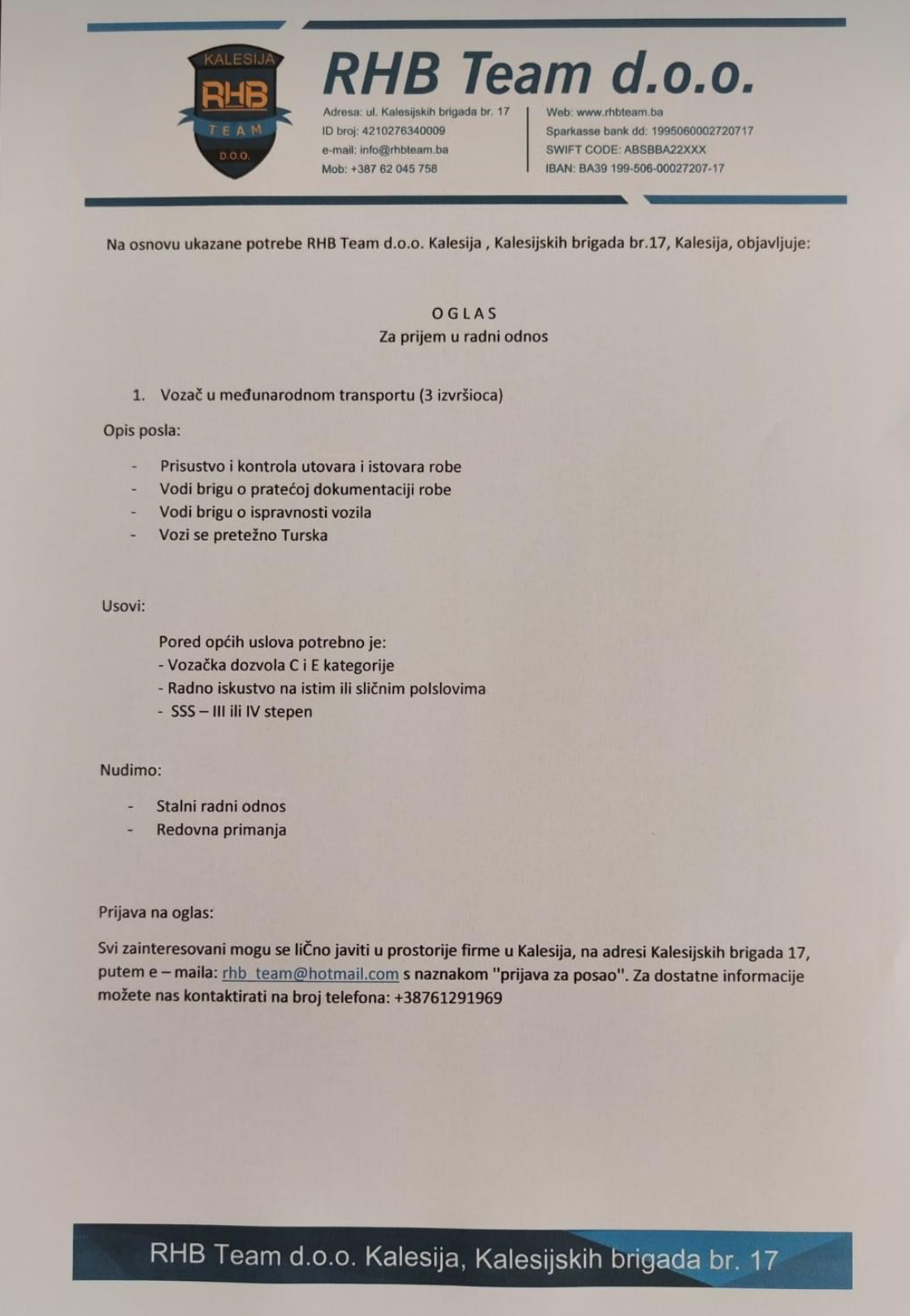 Home Kalesija RHB Team traži 3 (tri) vozača za međunarodni transport KalesijaNovostiPromocijaBosna i HercegovinaSaopštenjaTOP TEME RHB Team traži 3 (tri) vozača za međunarodni transport By nkp.ba - 9. Juna 2024. 782 0 SHARE Facebook Twitter Kalesijska kompanija RHB TEAM je objavila oglas za prijem 3 (tri) vozača u međunarodnom transportu. —- Javni oglas, sa uslovima i načinu prijave – prenosimo u cjelosti… (NKP.ba)