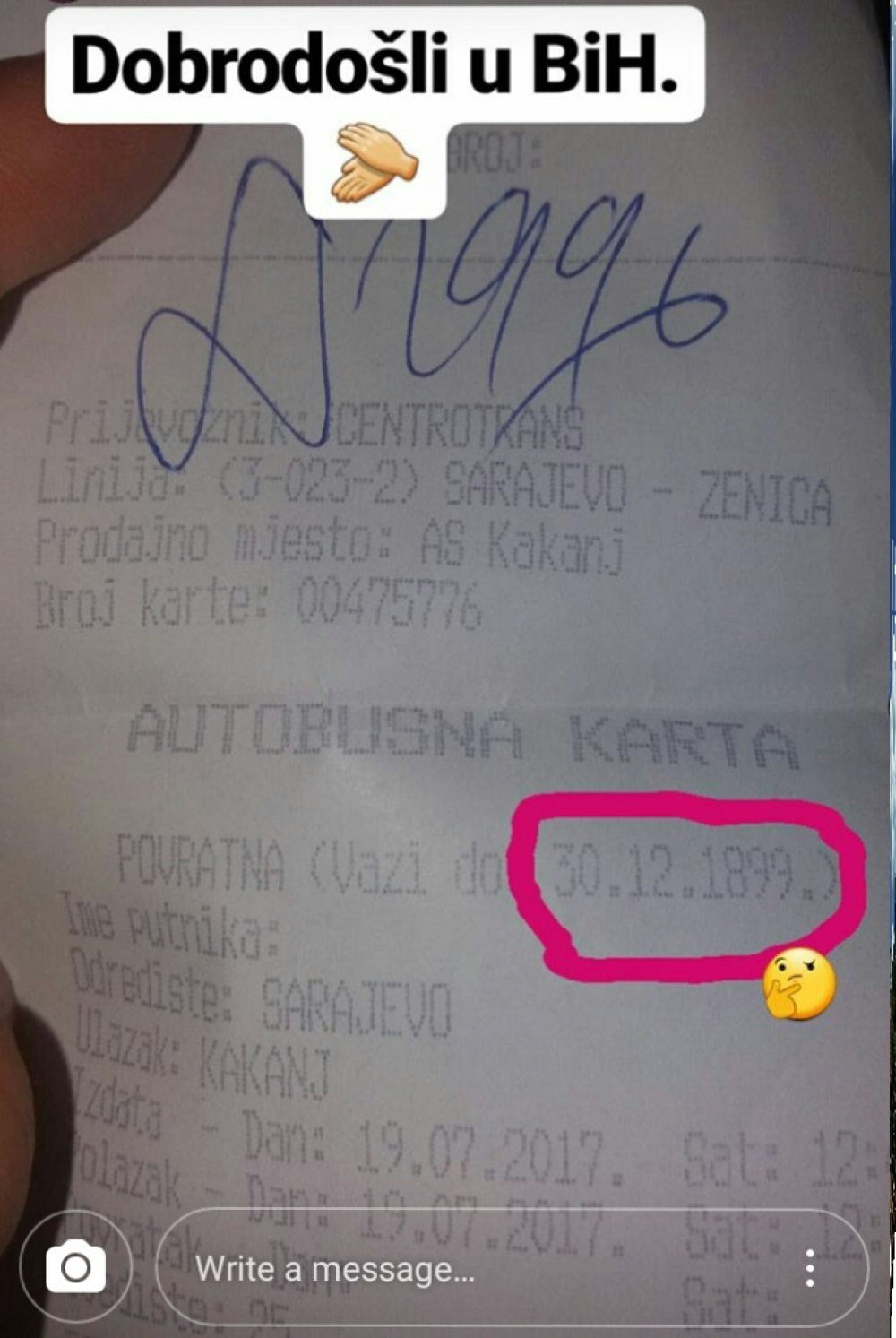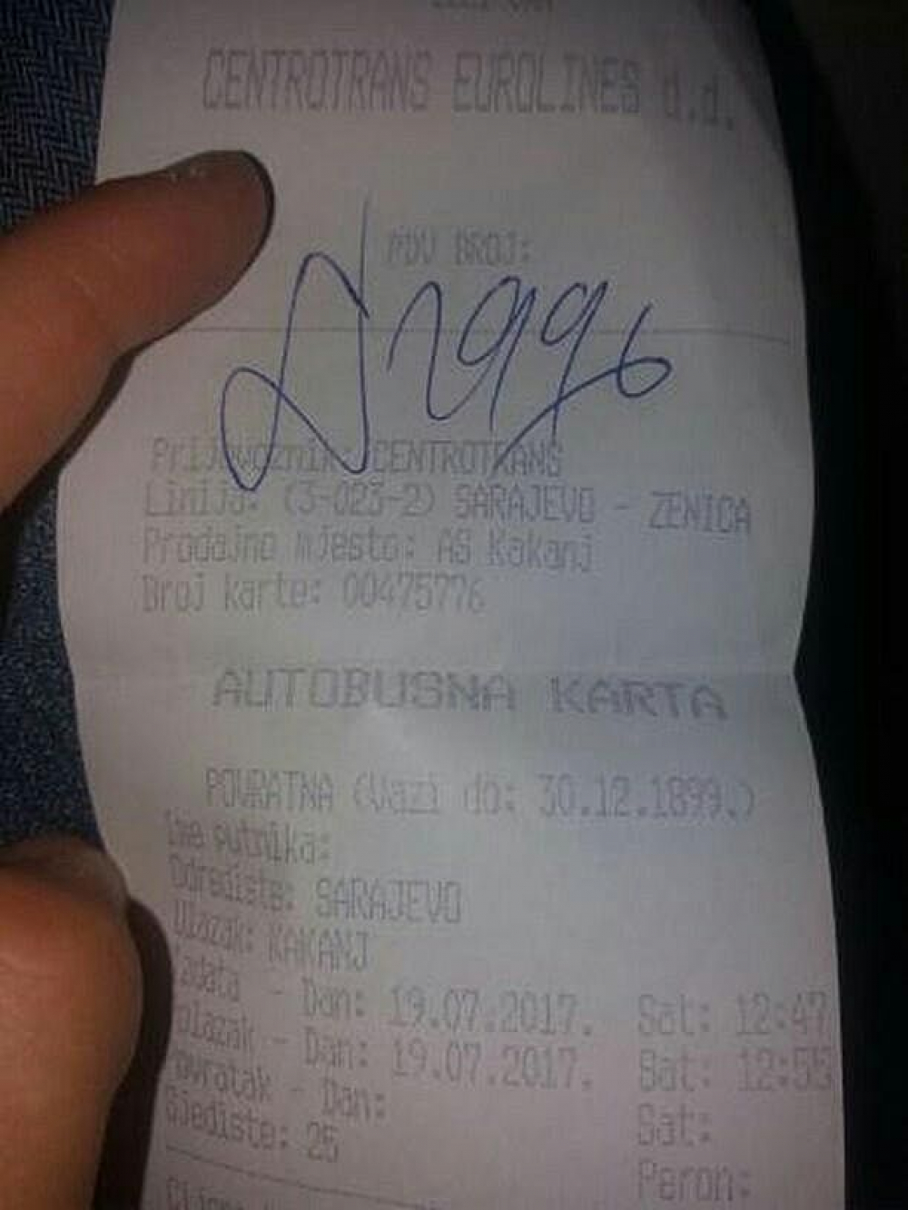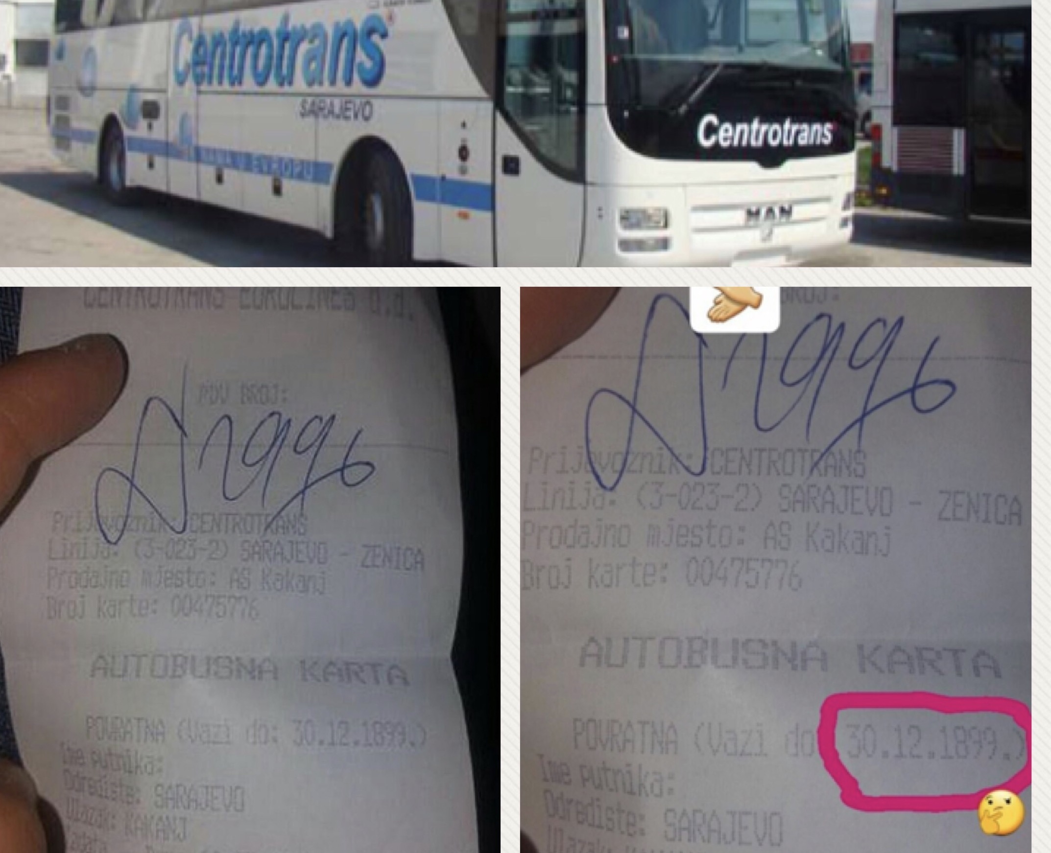 Naime dešava se to da kupljena autobusna povratna karta ovog mjeseca za relaciju Kakanj – Sarajevo vrijedi do 1899. godine.