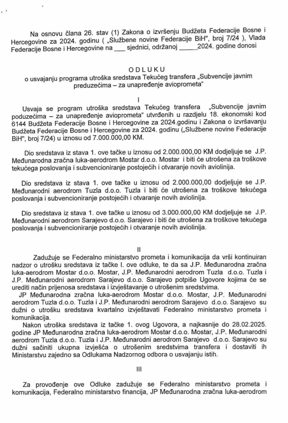 – 2.000.000,00 KM za J.P. Međunarodni aerodrom Tuzla i biti će utrošeni za troškove tekućega poslovanja i subvencioniranje postojećih i otvaranje novih aviolinija;