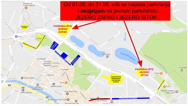 Obavještvamo sve korisnike naših usluga, da je prema odluci o izmjenama i dopunama Odluke o javnim parkiralištima na području Grada Tuzla, donesena odluka o naplati parkiranja i nedjeljom, saopćeno je iz “SIK”-a.