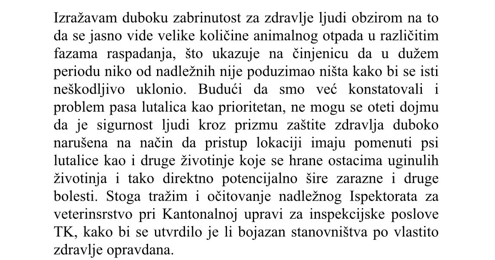 Nekoliko općinskih vijećnika u Općinskom vijeću Kalesija smatra da ovakvo stanje predstavlja ozbiljan rizik po javno zdravlje. Posebno upozoravaju na mogućnost širenja zaraznih bolesti putem pasa lutalica, divljih životinja i ptica, ali i na dugoročne posljedice po okoliš.