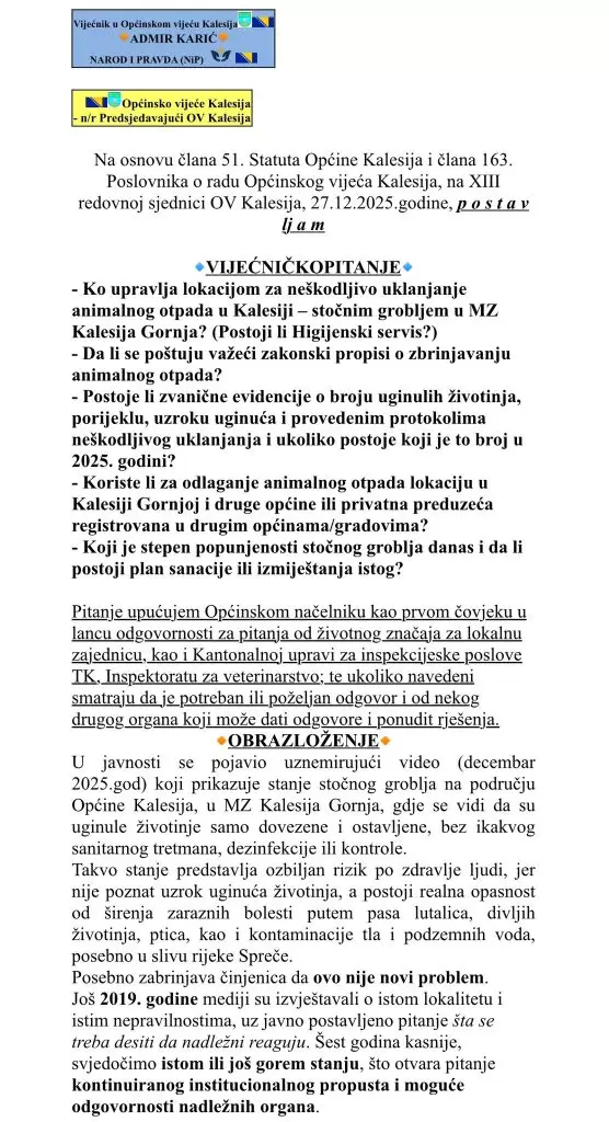 Prema njegovim navodima, direktor Veterinarske stanice Kalesija je na sjednici Općinskog vijeća u decembru 2025. godine kazao da je stočno groblje odavno izašlo iz svojih gabarita, te da je lokacija već treći put prekopavana zbog nedostatka prostora.