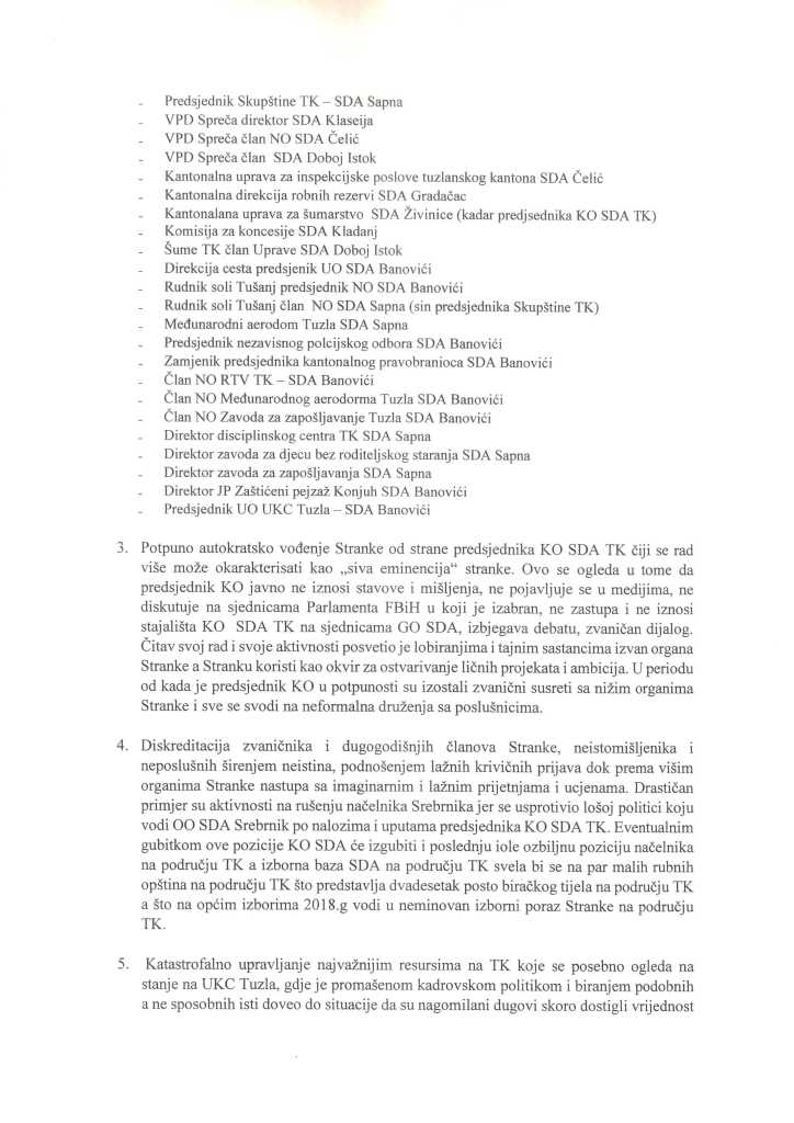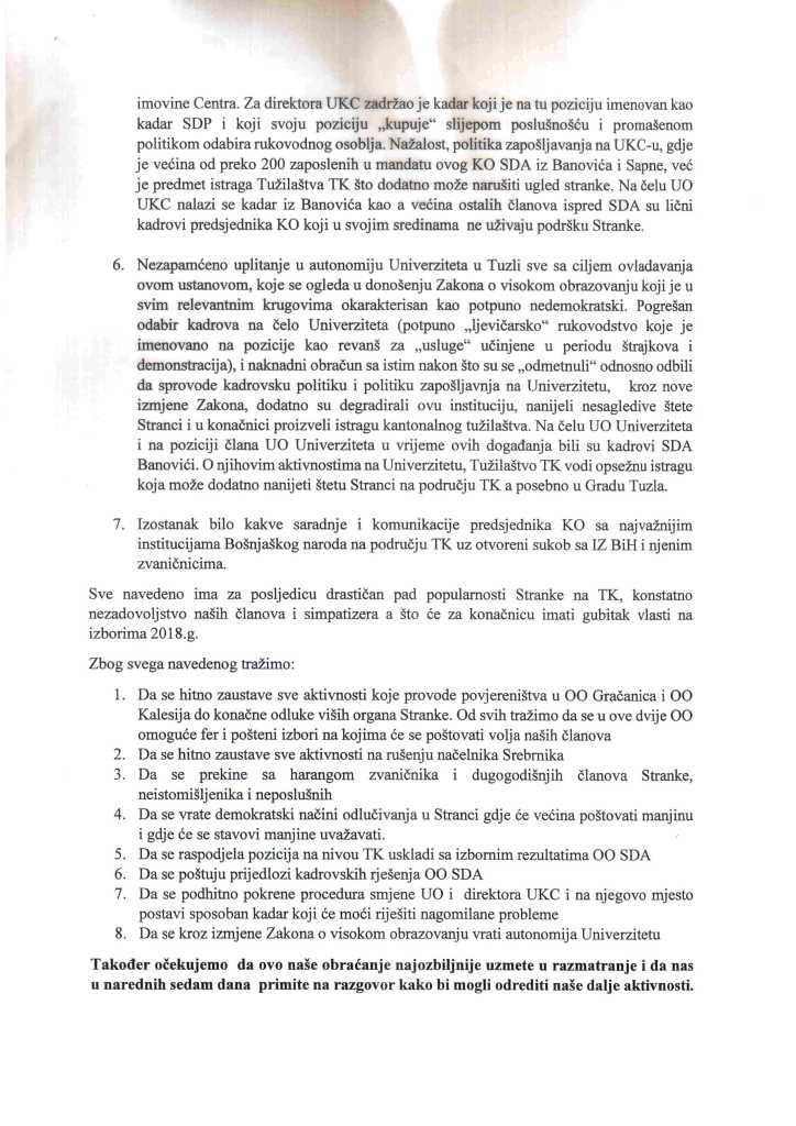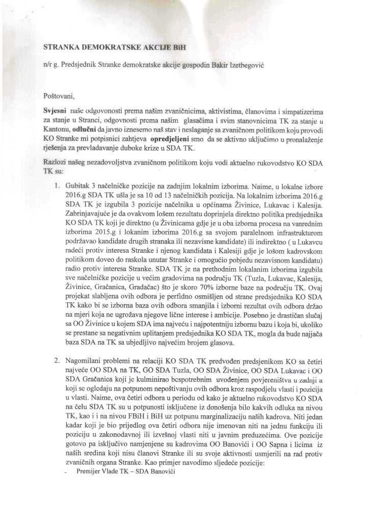 Grupa od četrnaest nezadovoljnih visopozicioniranih članova SDA iz Tuzlanskog kantona uputila je otvoreno pismo Bakiru Izetbegoviću, predsjedniku SDA, u kojem javno iznose stav i neslaganje sa zvaničnom politikom koju provodi Kantonalni odbor SDA TK.