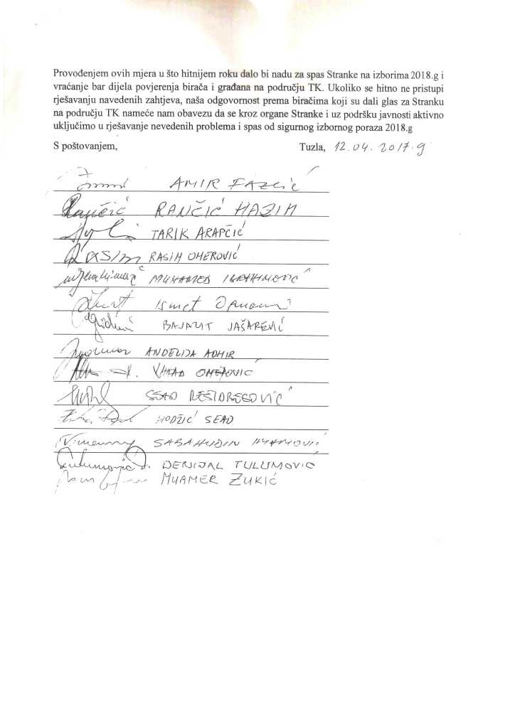 Među potpisnicima pisma, koji od Izetbegovića zahtijevaju da se aktivno uključe u pronalaženje rješenja za prevladavanje krize u SDA TK-a, su parlamentarci ove stranke od kantonalnog do državnog nivoa, predsjednici općinskih organizacija, članovi Glavnog odbora SDA BiH i drugi visokopozicionirani članovi SDA iz Tuzlanskog kantona.