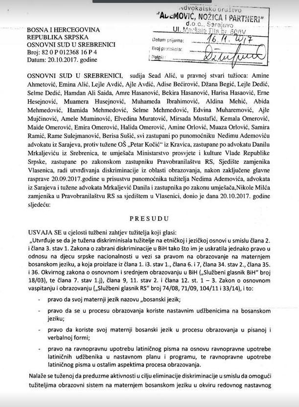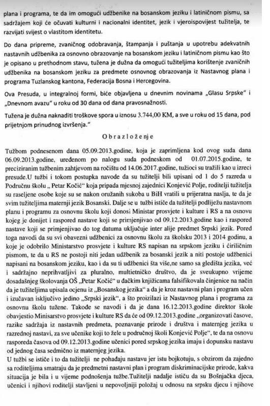 Sud je u cijelosti prihvatio tužbeni zahtjev te time, između ostalog, dao pravo učenicima, kao i njihovim roditeljima, da svoj maternji jezik nazovu “bosanski jezik”, pravo da se u procesu obrazovanja koriste nastavnim udžbenicima na bosanskom jeziku te da ga koriste u procesu obrazovanja u pisanoj i verbalnoj formi, kao i pravo na upotrebu latiničnog pisma.