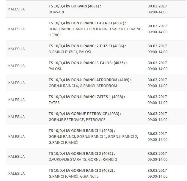 Elektroprivreda Bosne i Hercegovine obavještava da će zbog redovnih radova doći do prekida u snabdijevanju strujom u naseljima Bukvari, Donji Rainci (Čanići, Salkići, Herići, Puzići, Paloši, Pedići), Gornji Rainci (Aerodrom, Pjanići), Zates, Gornje Petrovice, Jeginov Lug, Lipovice, Meškovići, Međaš (Dolina, Javrići, Međaš raskršće, Međaš pista, Rajkovine, Zulići), Novi Tojšići, Meškovići i Babina Luka.