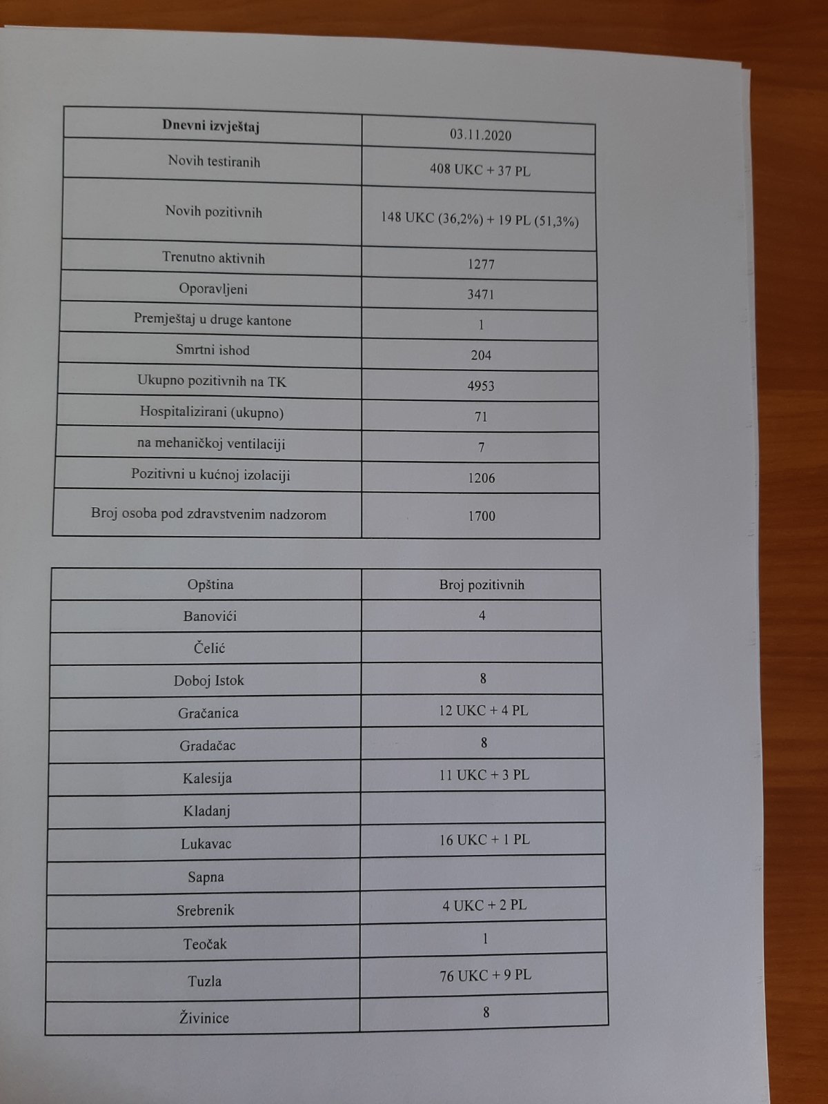 Trenutno je u TK aktivno pozitivno 1277 osoba, od čega je 71 hospitalizirano u UKC-u Tuzla. Na respiratore je priključeno 7 osoba.