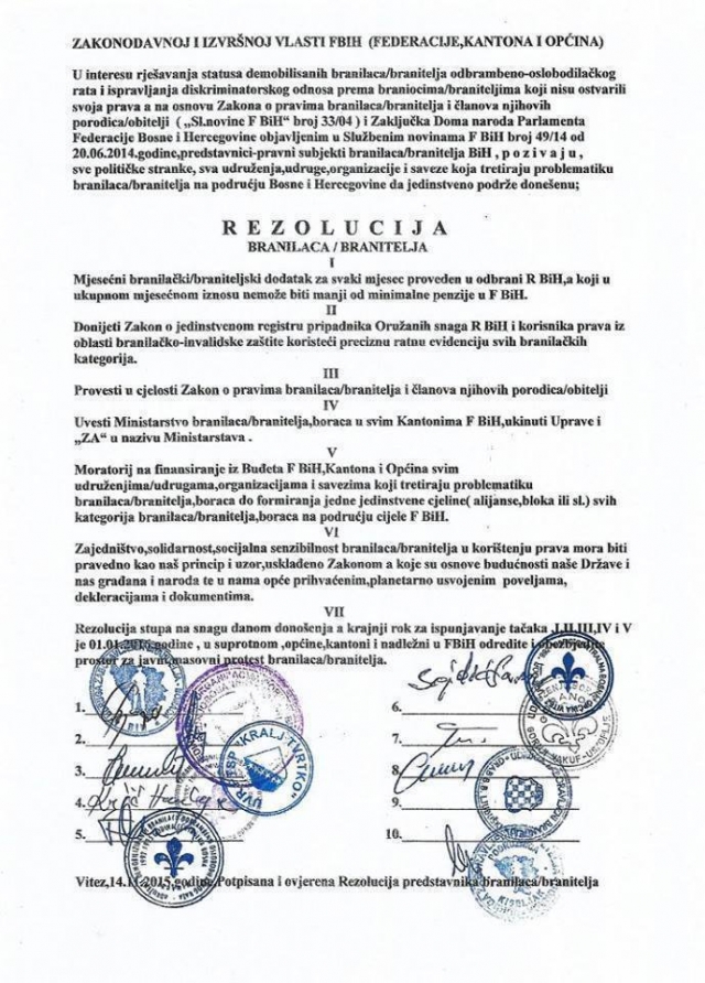 Savjet branilaca/branitelja potpisnica Rezolucije obavještava pripadnike Armije BiH, HVO-a i MUP-a, građane i javnost da su sve pripreme pred održavanje sutrašnjih protesta uspješno privedene kraju. Na proteste izlazimo mirno i dostojanstveno, čista obraza i uzdignuta čela da konačno poslije više od 20 godina zaustavimo bezočnu manipulaciju i zloupotrebu boraca,stoji u saopćenju za javnost koje potpisuje predsjednik Savjeta Selvedin Bulbul, prenosi novinska agencija Patria.