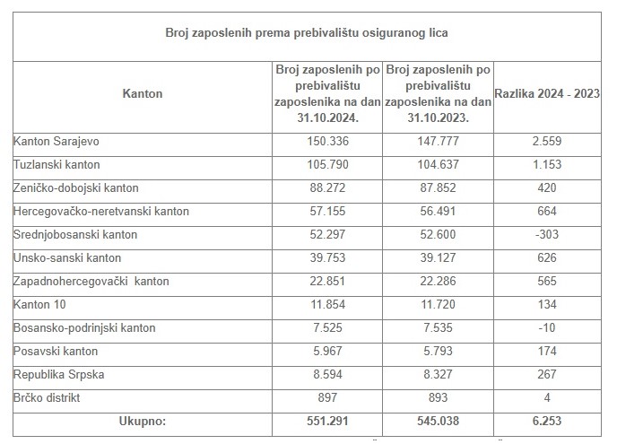 Broj zaposlenih prema prebivalištu zaposlenika na dan 31.10.2024. godine je 551.291. U odnosu na objavljeni podatak o broju zaposlenih na dan 31.10.2023. godine kada je broj zaposlenih iznosio 545.038, ovaj broj je veći za 6.253, a u odnosu na prethodno objavljeni podatak o broju zaposlenih na dan 30.9.2024. godine kada je iznosio 550.801, veći je za 490.