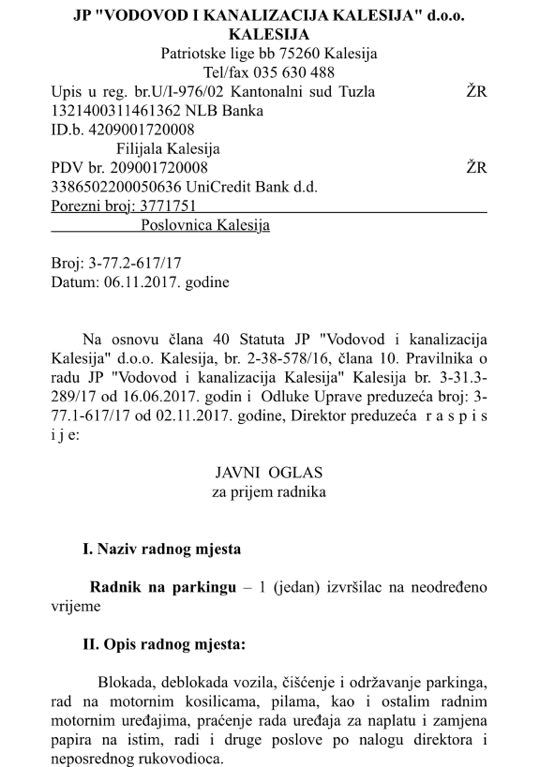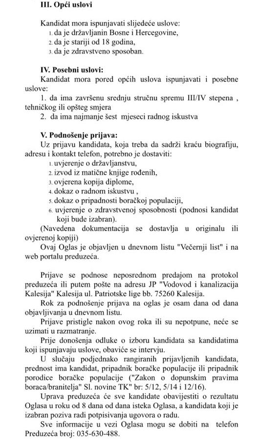 Naime, raspisan je Konkurs za posao u JP “Vodovod i kanalizacija” (1 izvršilac) i to na neodređeno vrijeme, što je svakako lijepa vijest za građane Kalesije.